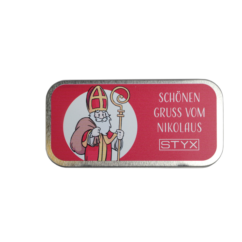 Liebevoll bedruckte Metallbox im Nikolo-Design für die gefüllten 70g Pralinenriegel der STYX Schokoladenmanufaktur.