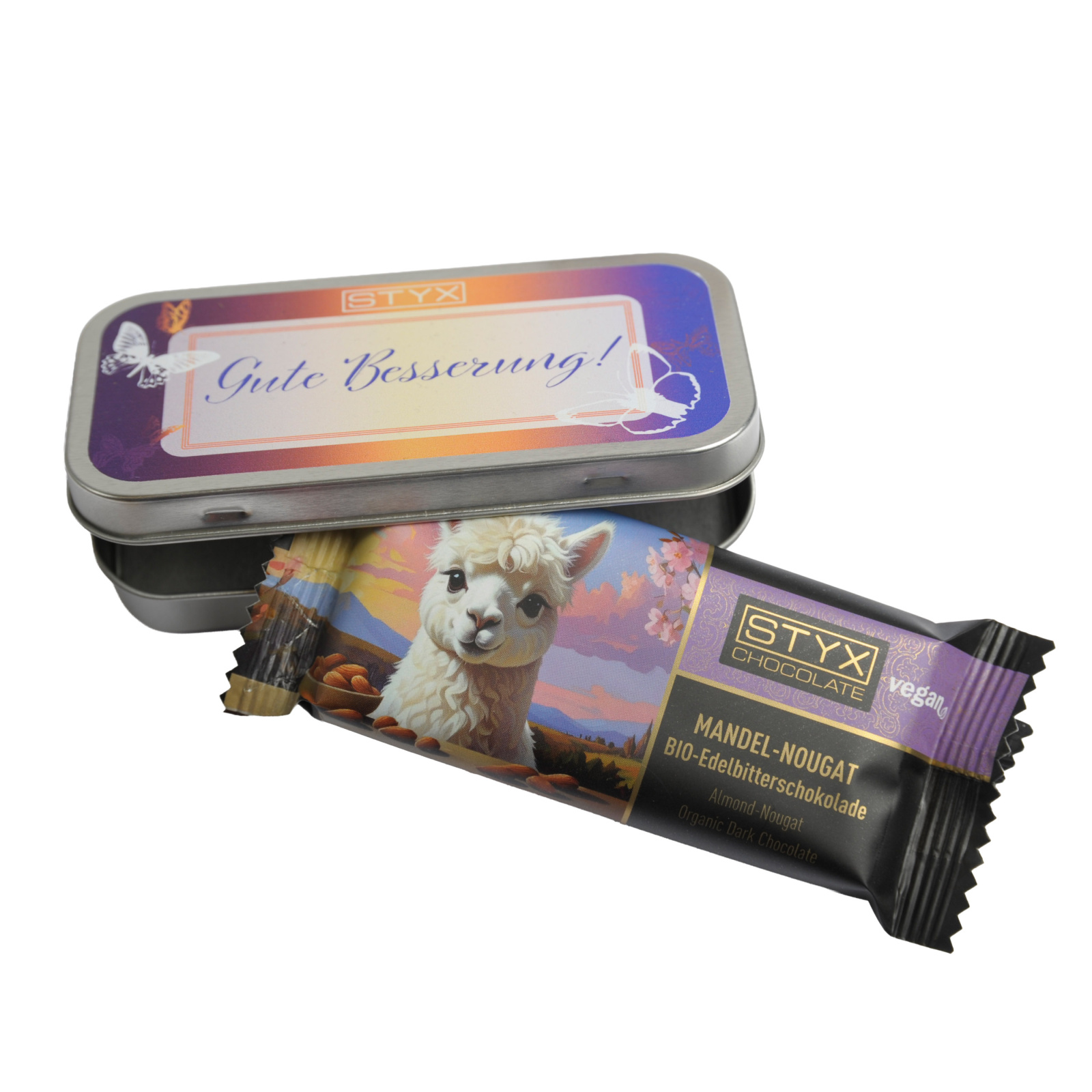 • Liebevoll bedrucktes Metalletui für die gefüllten 70g Pralinenriegel von STYX.