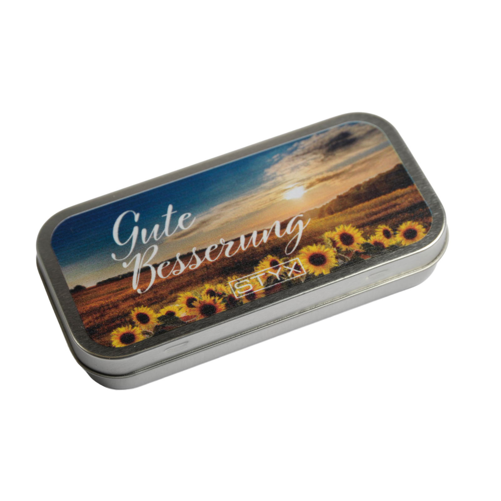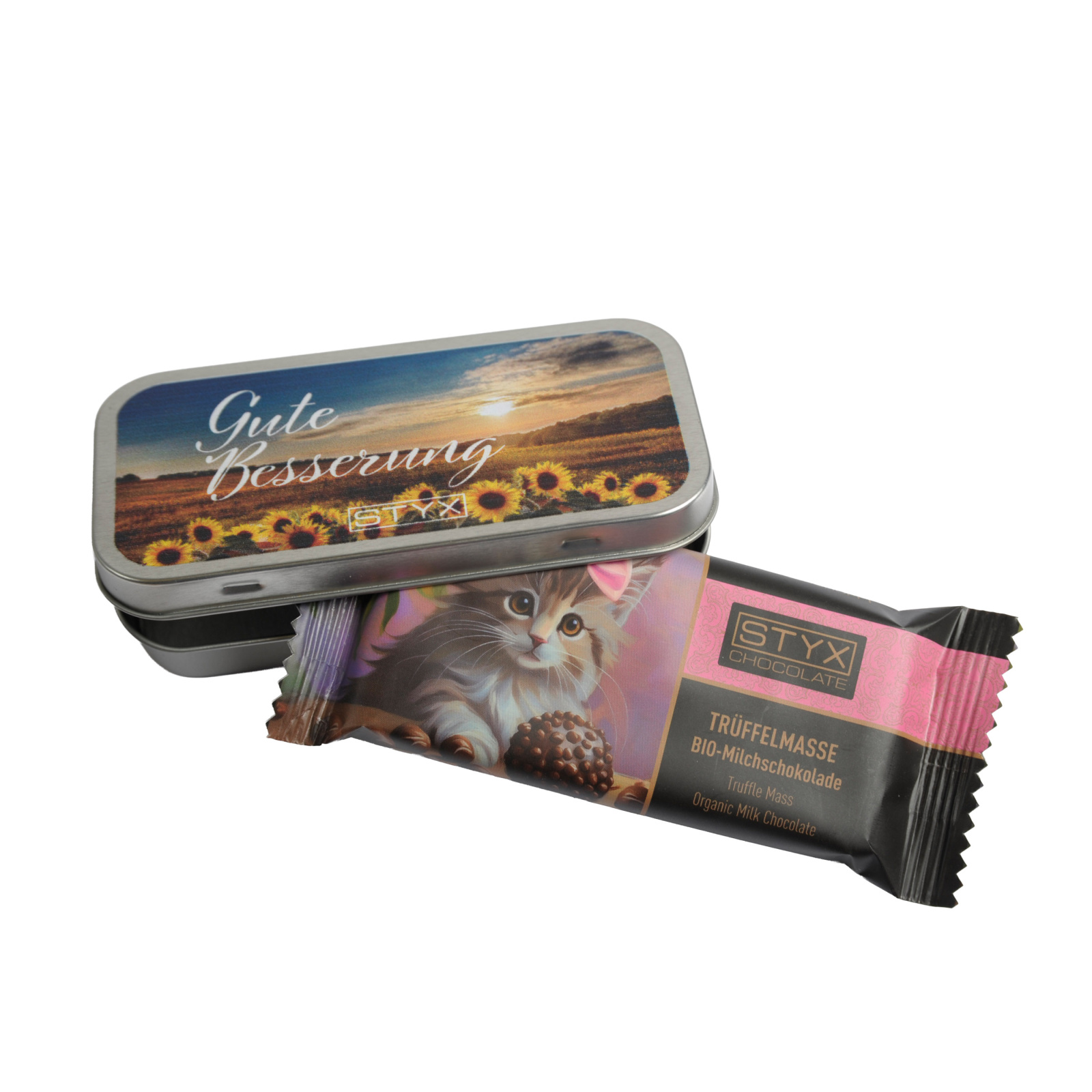 • Liebevoll bedrucktes Metalletui für die gefüllten 70g Pralinenriegel von STYX.