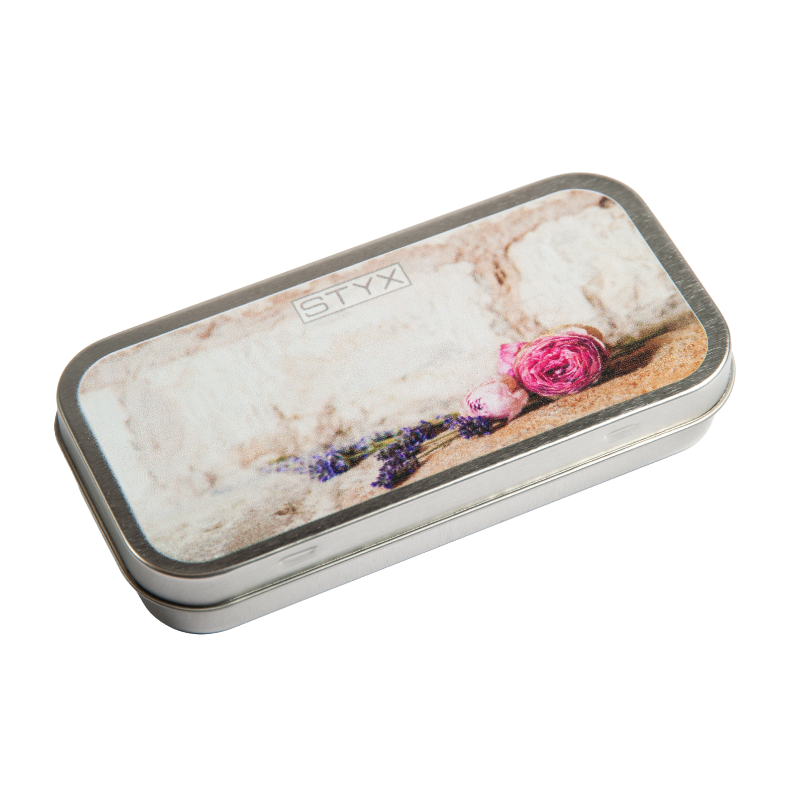 • Liebevoll bedrucktes Metalletui für die gefüllten 70g Pralinenriegel der STYX Schokoladenmanufaktur.