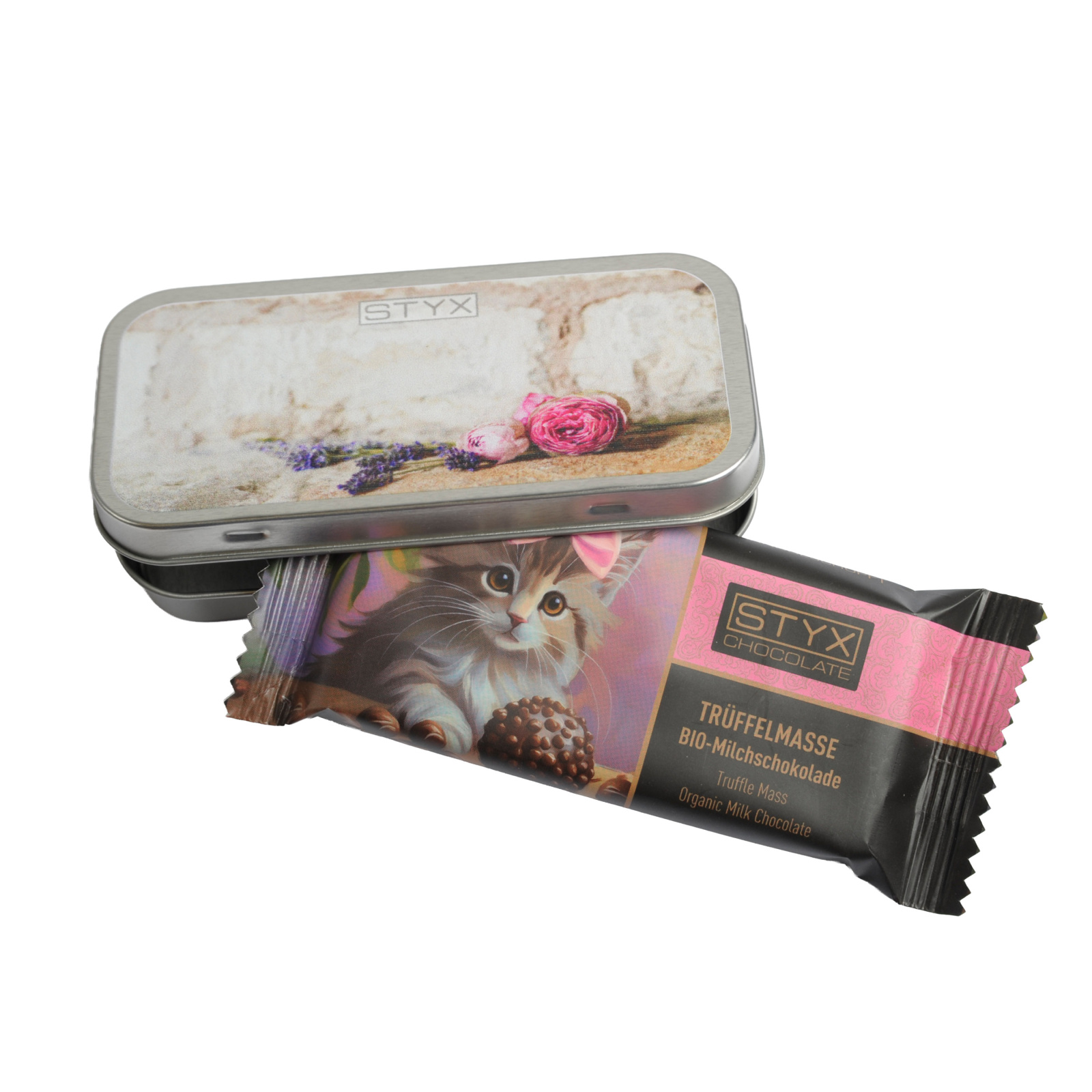 • Liebevoll bedrucktes Metalletui für die gefüllten 70g Pralinenriegel von STYX.